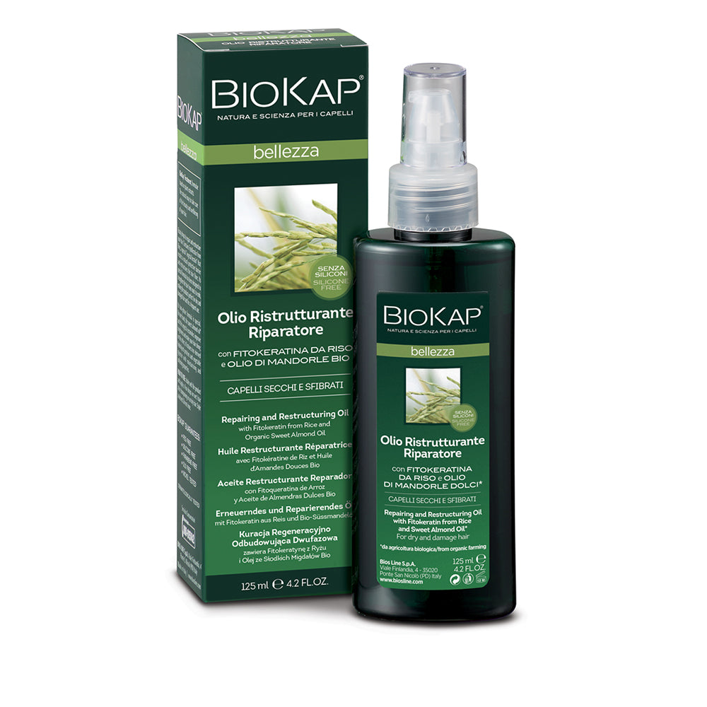 BioKap® Olio Ristrutturante Riparatore , gocce di bellezza per i capelli ad effetto riparatore. Contiene Fitokeratina da Riso, una speciale “cheratina vegetale” che crea una barriera naturale protettiva e ristrutturante sulla fibra capillare. La sua speciale formula aiuta a rinforzare il capello, dalle radici alle punte, e lo rende ideale per capelli secchi, sfibrati e aridi, e per un uso frequente.