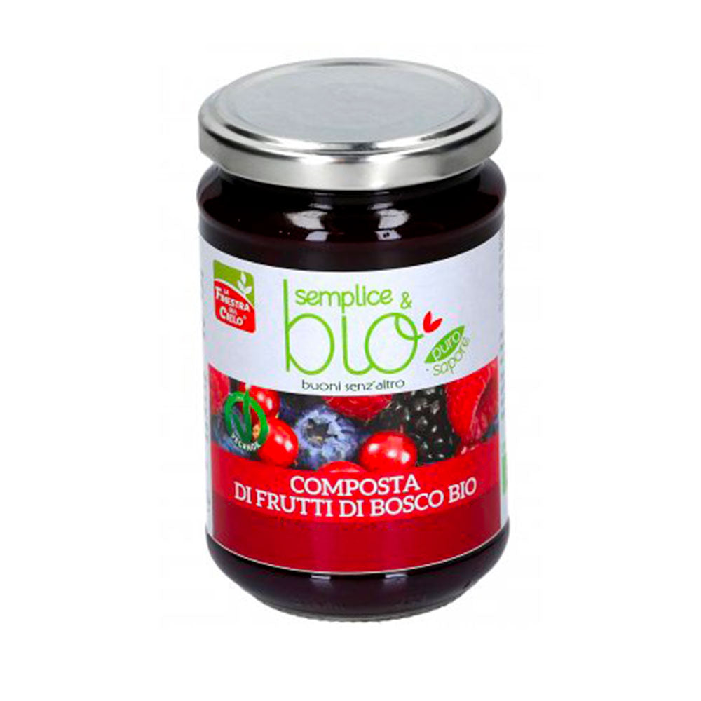 Frutti di bosco* in proporzione variabile (more*, mirtilli*, lamponi*, ribes*) (70%), succo di mela concentrato*, purea di mela*, gelificante: pectina. *biologico.