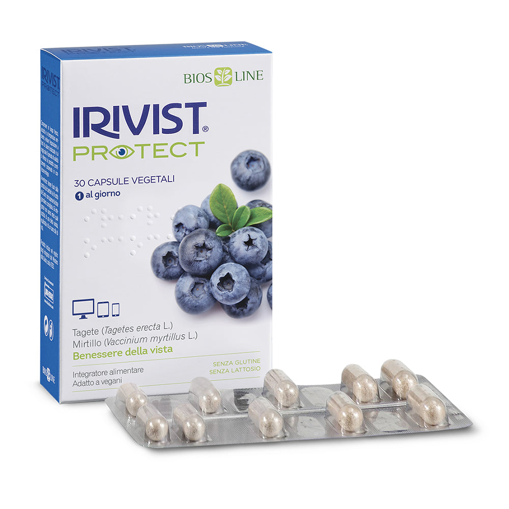 L’uso prolungato di device come computer, tablet e cellulari può affaticare la vista. Irivist® PROTECT favorisce il benessere della vista grazie alla sua formula a base di XanMax®, un particolare estratto brevettato di Tagete titolato in Luteina e Zeaxantina, carotenoidi presenti nella macula dell’occhio, dotato di azione antiossidante. La formulazione è completata da estratto di Mirtillo nero titolato in antociani, utile per la funzionalità del microcircolo e da Vitamina A, che contribuisce alla normale funzione visiva.