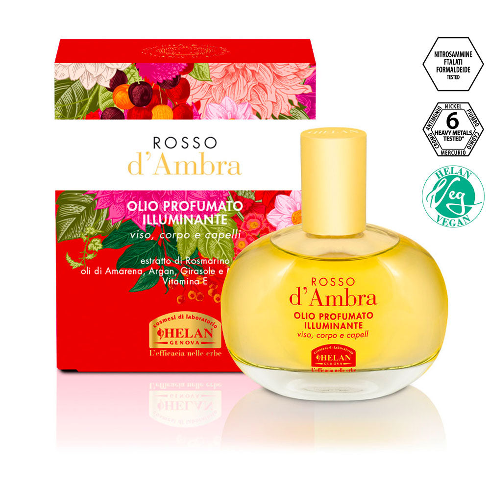 Una calibrata miscela di pregiati oli spremuti a freddo di semi e frutti di Amarena, Argan, Girasole e Mandorle dolci ricchi in acidi grassi essenziali, importanti costituenti delle membrane cellulari, che rende la pelle istantaneamente radiosa e brillante con una texture leggera. Formula arricchita dalla Vitamina E con potente azione antiossidante, nutre e idrata la cute mostrando un’azione efficace nella ricostituzione della barriera cutanea e migliorandone l’elasticità, mentre l’estratto di Rosmarino è ideale per una specifica azione ristrutturante del capello.